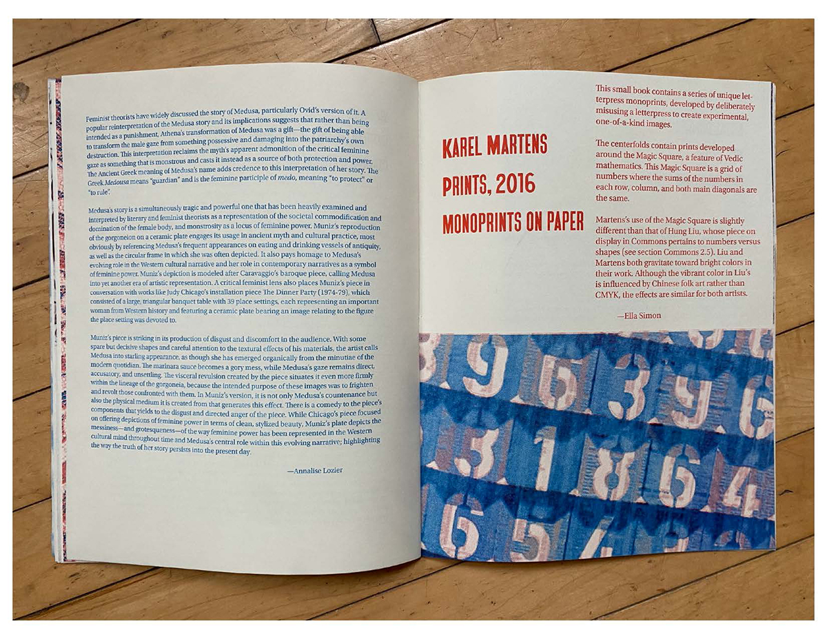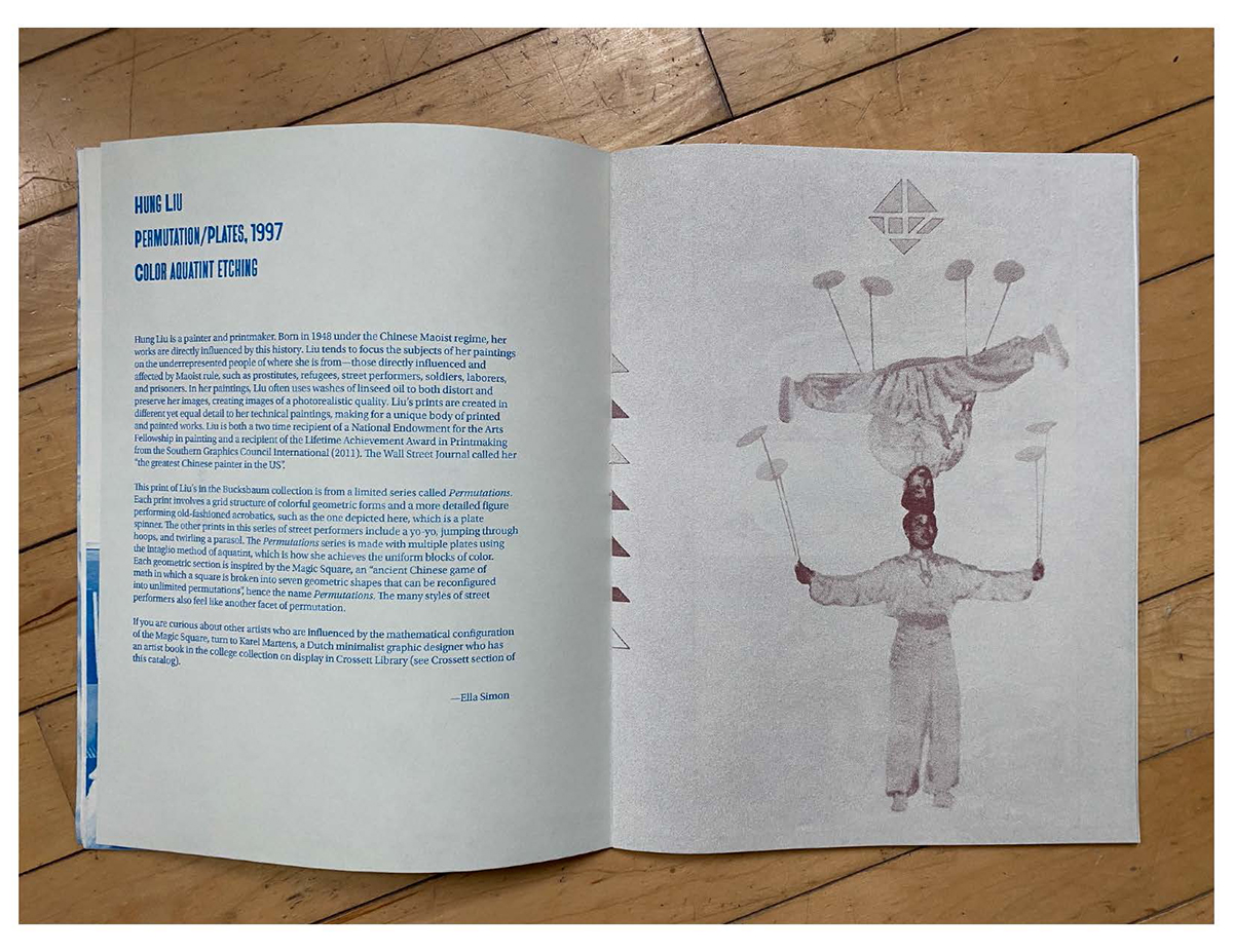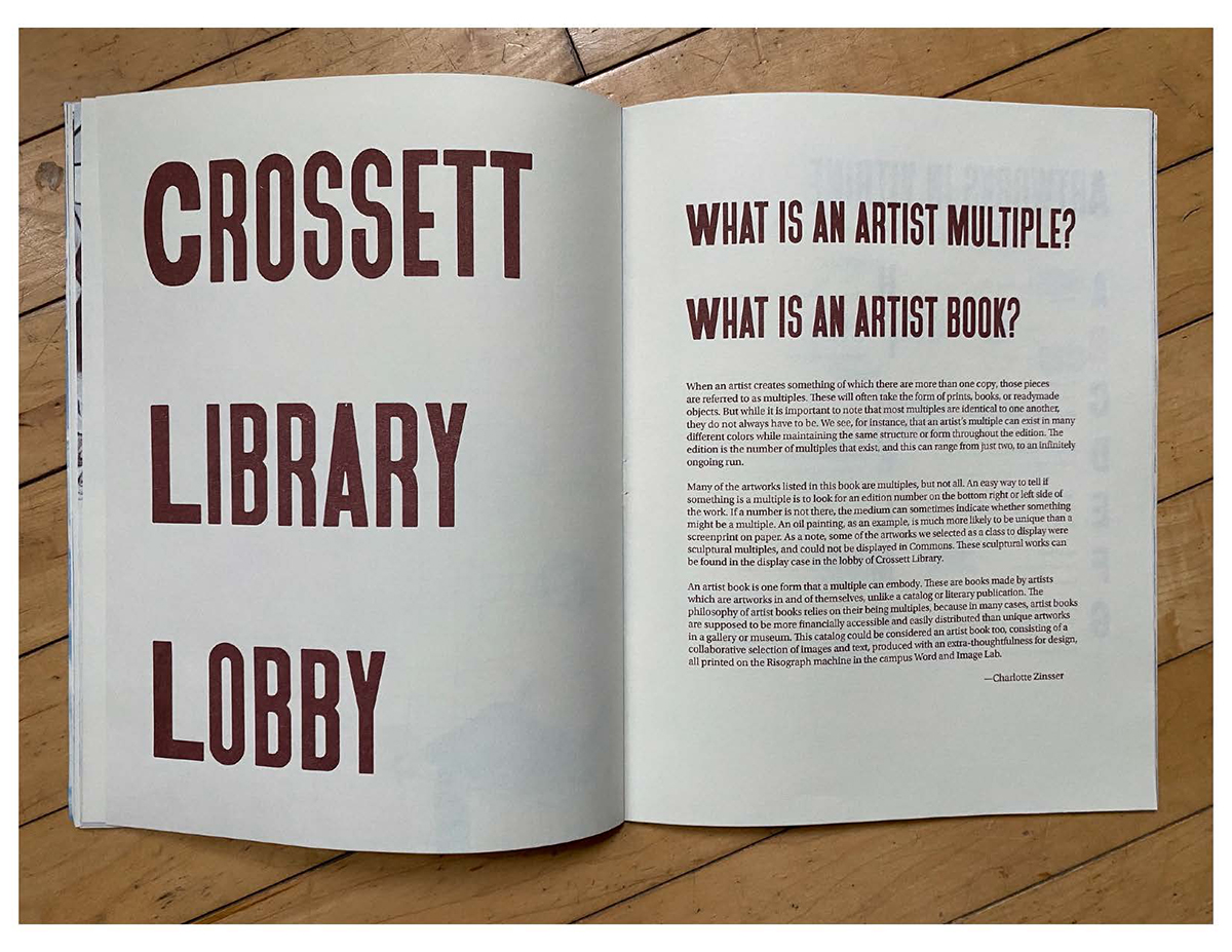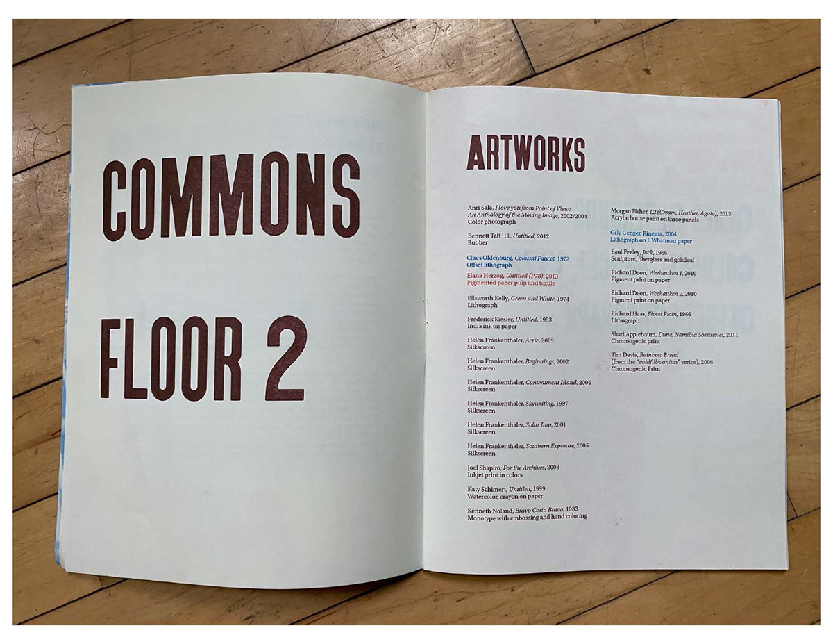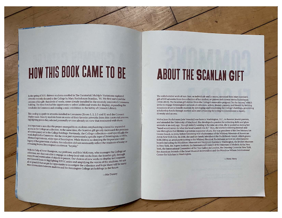 As a collaborative final project, students in the class The Curatorial: Multiple Variations created an “exhibition as catalog” highlighting contemporary artworks recently donated by Mary Bucksbaum Scanlan (class of 1991) from the estate of her mother, Melva Bucksbaum. Students surveyed and researched the contents of the gift: hundreds of artworks, some of them already installed in the recently renovated Commons building. The class then had the opportunity to choose additional works for display, expanding the installation in Commons and creating a mini-exhibition in the lobby of Crossett Library. This catalog contains writings by the 13 class members about selected artworks and their overall curatorial process.