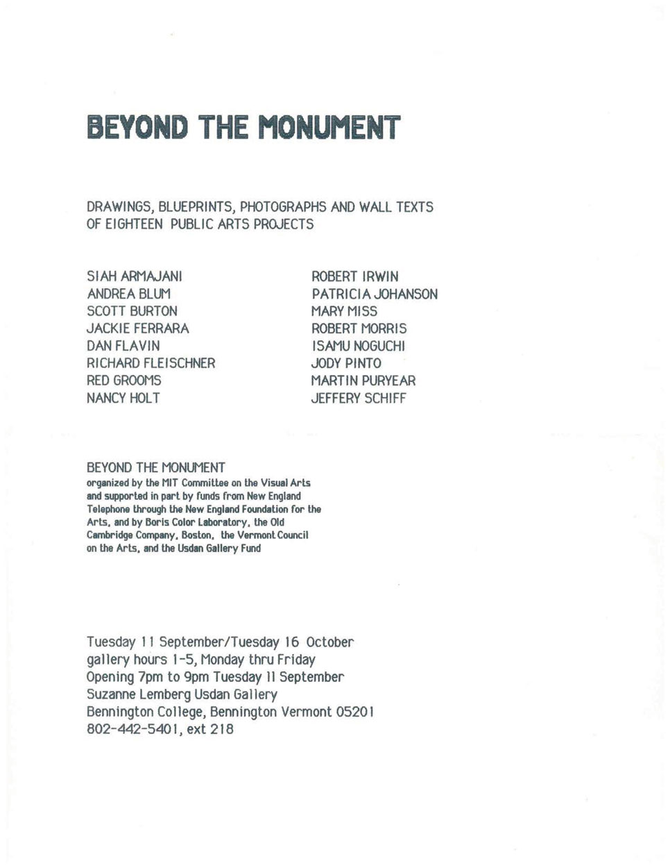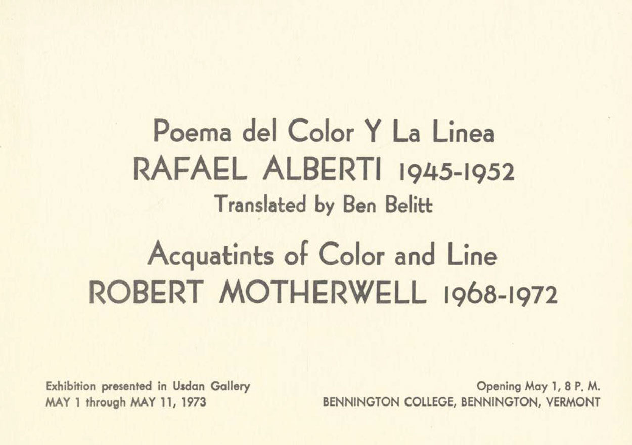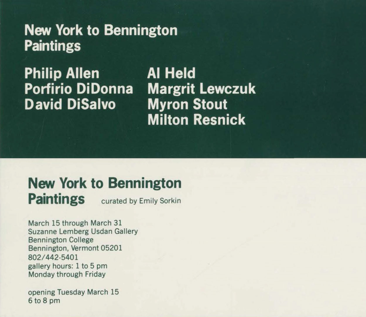 Posters, cards, brochures and other documents illustrate the history of exhibitions and events at the College. Prior to the opening of Usdan Gallery in 1976, exhibits were installed in The New Gallery (now Deane Carriage Barn).